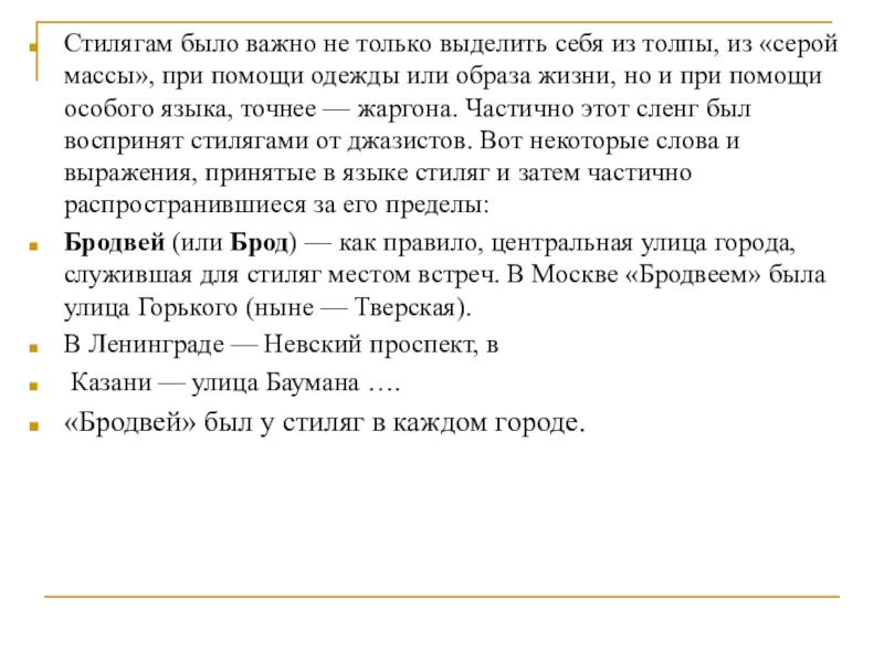 массы», при помощи одежды или образа жизни, но и при помощи особого языка, точнее — жаргона. Частично этот сленг был воспринят стилягами от джазистов. Вот некоторые слова и выражения, принятые в языке стиляг и затем частично распространившиеся за его пределы: