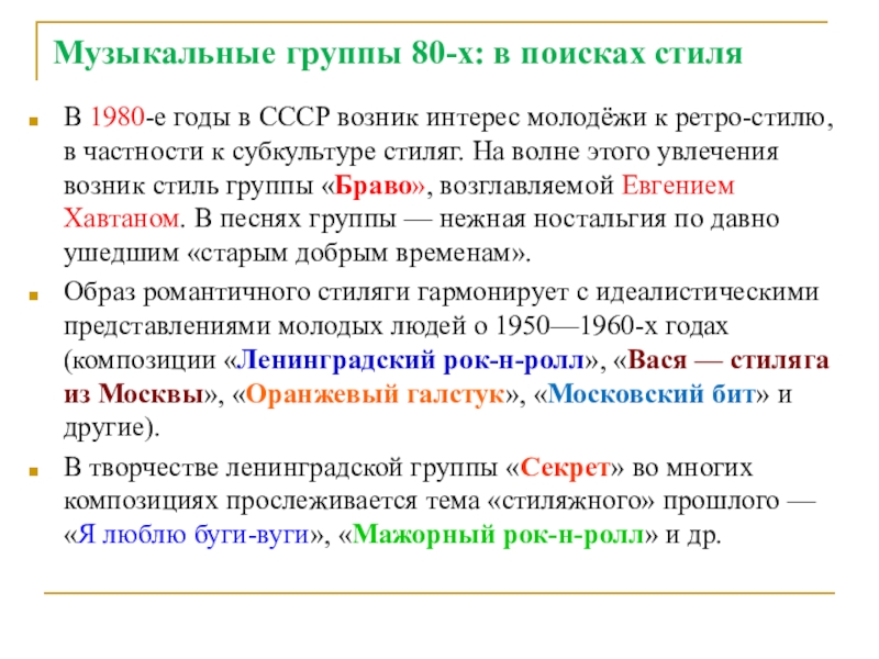 в частности к субкультуре стиляг. На волне этого увлечения возник стиль группы «Браво», возглавляемой Евгением Хавтаном. В песнях группы — нежная ностальгия по давно ушедшим «старым добрым временам».