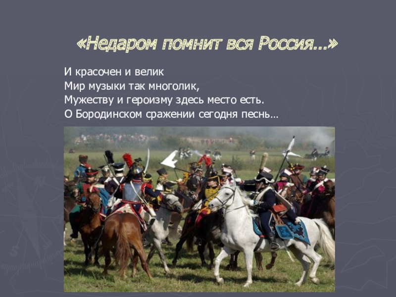 О доблести и патриотизме русских солдат, генералов, офицеров, партизан и народных ополченцев сложены легенды и песни, сохранились архивные документы и воспоминания участников Отечественной войны 1812 года. Созданы романы и повести, стихотворения и пьесы. Пушкин, Лермонтов, Жуковский, Давыдов, Баратынский, Рылеев, Толстой, Глинка и многие писатели отдали дань подвигу русской армии, нанесшей смертельную рану при Бородине знаменитой и считавшейся непобедимой армии Наполеона. «Недаром помнит вся Россия» славные имена Кутузова, Барклая, Багратиона, Давыдова, Дуровой, Кожиной и других героев Бородинской битвы.