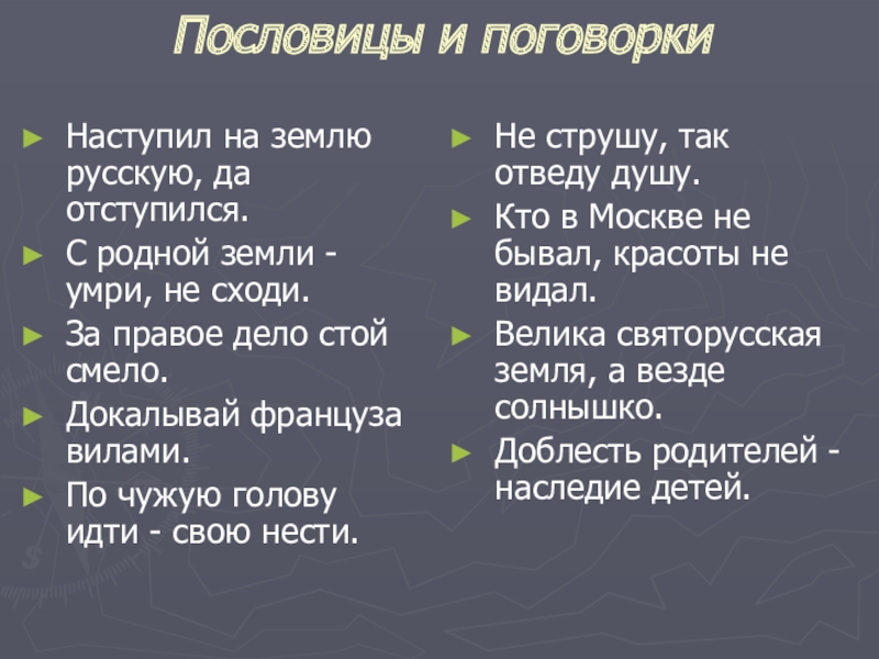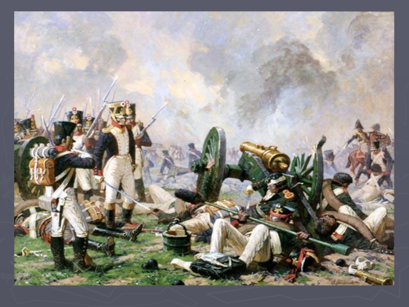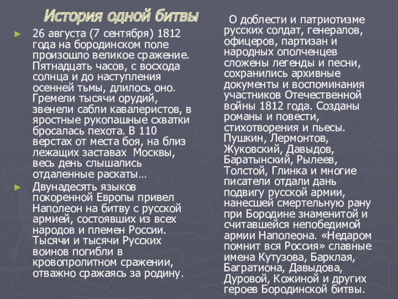 Двунадесять языков покоренной Европы привел Наполеон на битву с русской армией, состоявших из всех народов и племен России. Тысячи и тысячи Русских воинов погибли в кровопролитном сражении, отважно сражаясь за родину.