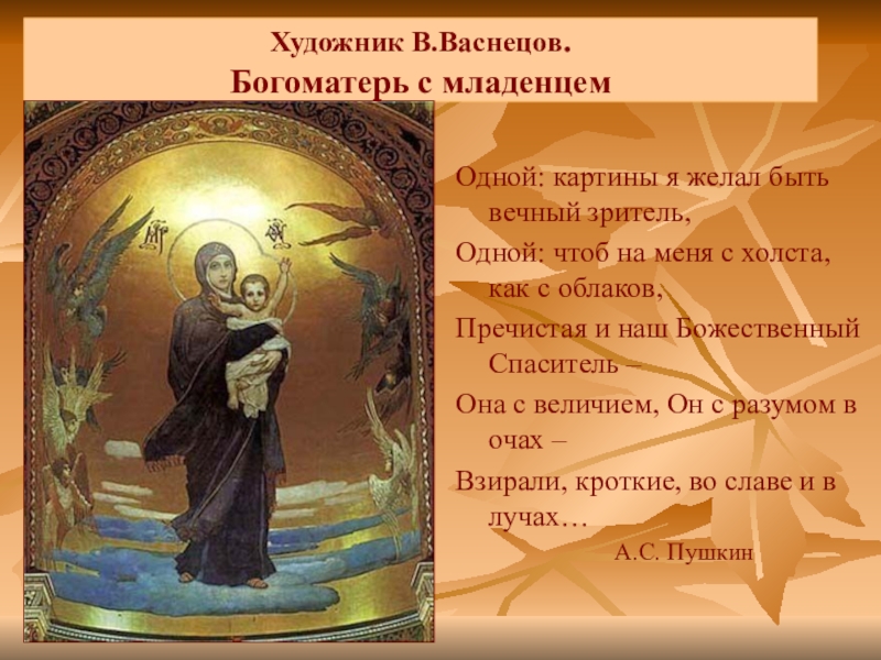 Художник В.Васнецов.  Богоматерь с младенцемХудожник В.Васнецов. Богоматерь с младенцемОдной: картины я желал быть вечный зритель,Одной: чтоб