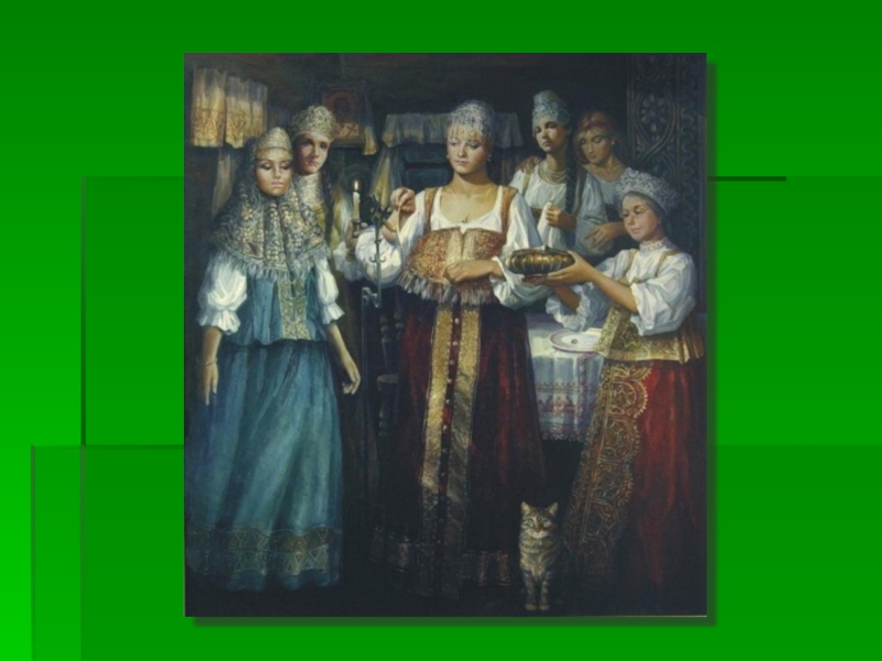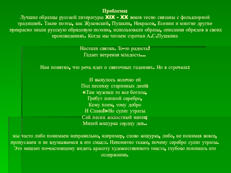фольклорной традицией. Такие поэты, как Жуковский, Пушкин, Некрасов, Есенин и многие другие прекрасно знали русскую обрядовую поэзию, использовали образы, описания обрядов в своих произведениях. Когда мы читаем строчки А.С.Пушкина