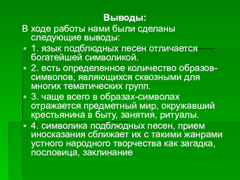 4. символика подблюдных песен, прием иносказания сближает их с такими жанрами устного народного творчества как загадка, пословица, заклинание