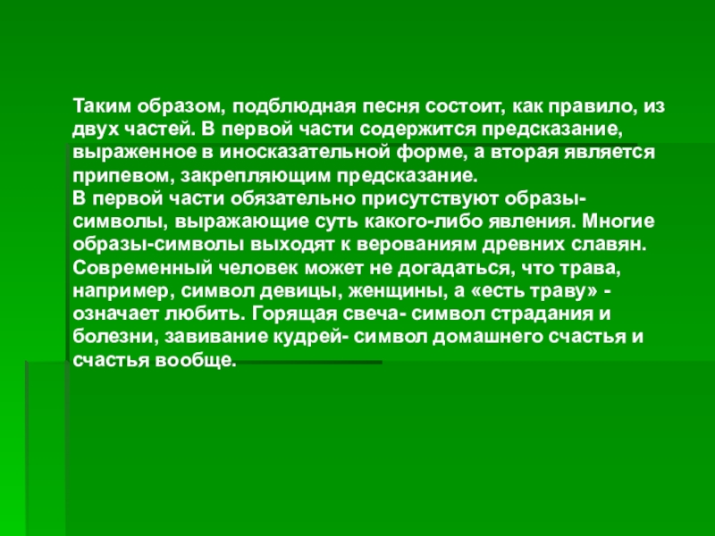 Слайд 10Таким образом, подблюдная песня состоит, как правило, из