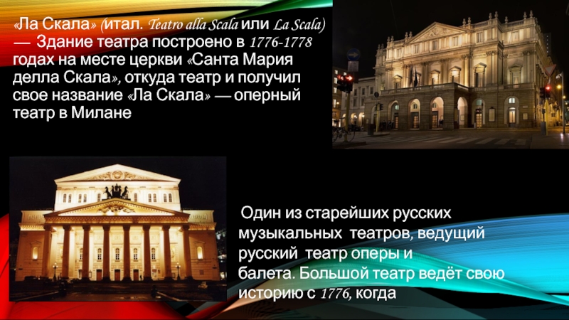 Один из старейших русских музыкальных театров, ведущий русский театр оперы и балета. Большой театр ведёт свою историю с 1776, когда