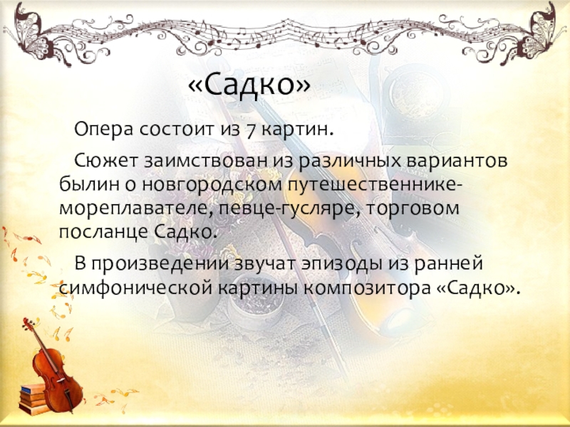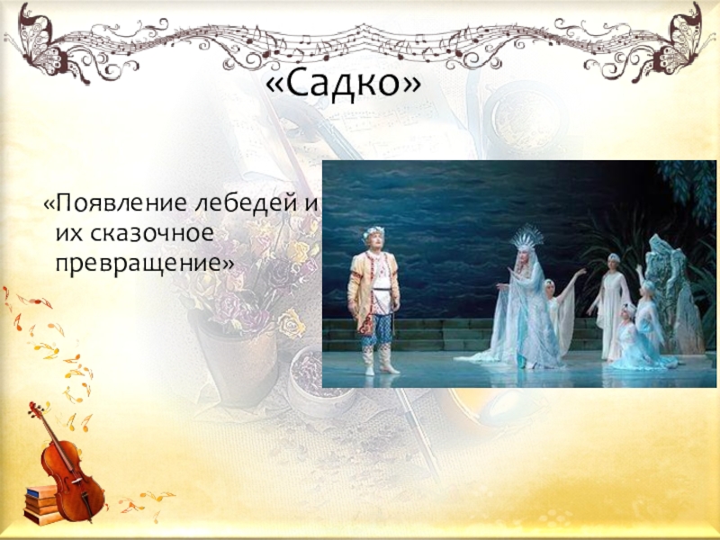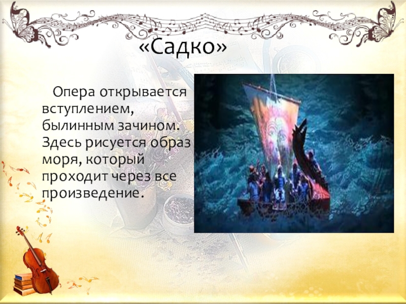 В произведении звучат эпизоды из ранней симфонической картины композитора «Садко».