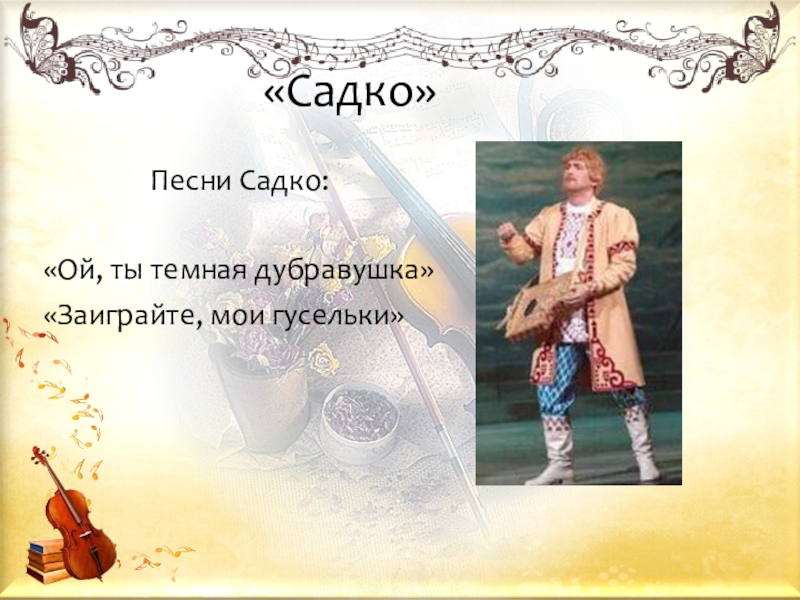Сюжет заимствован из различных вариантов былин о новгородском путешественнике-мореплавателе, певце-гусляре, торговом посланце Садко.