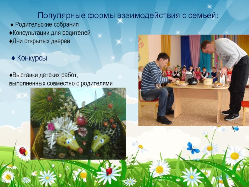 Популярные формы взаимодействия с семьей: ♦ Родительские собрания♦Консультации для родителей♦Дни открытых дверей ♦ Конкурсы♦Выставки детских работ,выполненных совместно