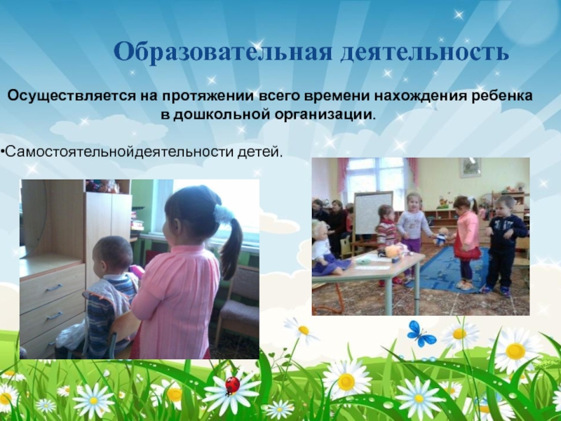 Образовательная деятельностьОсуществляется на протяжении всего времени нахождения ребенка в дошкольной организации.Самостоятельнойдеятельности детей.