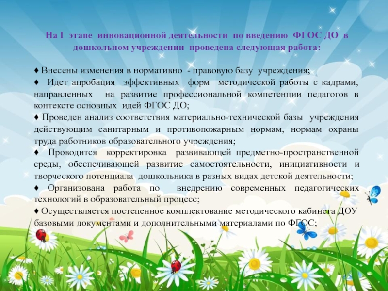 На I этапе инновационной деятельности по введению ФГОС ДО в дошкольном учреждении проведена следующая работа:♦ Внесены изменения