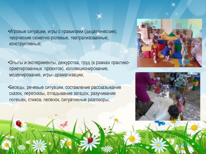 Игровые ситуации, игры с правилами (дидактические), творческие сюжетно-ролевые, театрализованные, конструктивные;Опыты и эксперименты, дежурства, труд (в рамках практико-