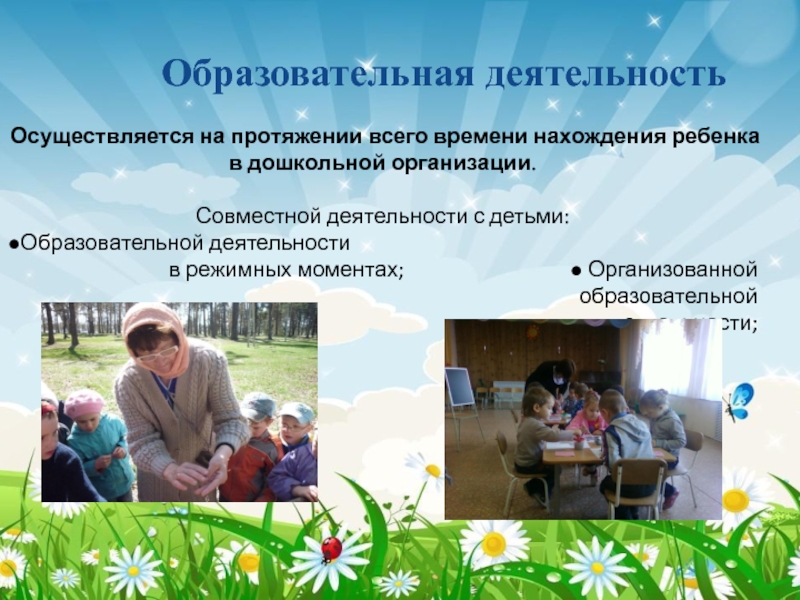 Образовательная деятельностьОсуществляется на протяжении всего времени нахождения ребенка в дошкольной организации.Совместной деятельности с детьми:●Образовательной деятельностив режимных моментах;