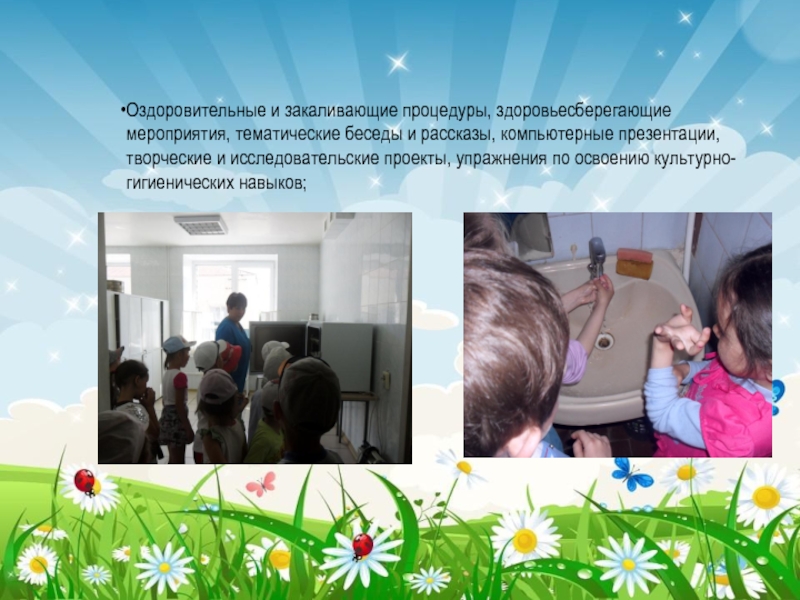 Оздоровительные и закаливающие процедуры, здоровьесберегающие мероприятия, тематические беседы и рассказы, компьютерные