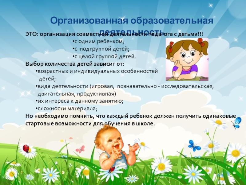 Организованная образовательная деятельность ЭТО: организация совместной деятельности педагога с детьми!!!с одним ребенком;с подгруппой детей;с целой группой детей.Выбор