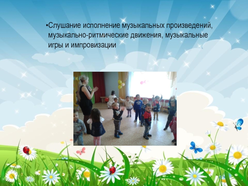 Слушание исполнение музыкальных произведений, музыкально-ритмические движения, музыкальные игры и импровизации