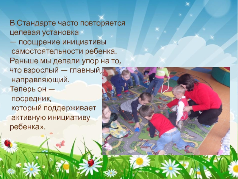 В Стандарте часто повторяется целевая установка — поощрение инициативы самостоятельности ребенка.Раньше мы делали упор на то, что взрослый