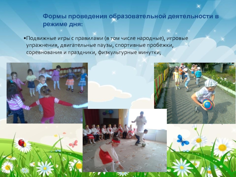Формы проведения образовательной деятельности в режиме дня:Подвижные игры с правилами (в том числе народные), игровые упражнения, двигательные