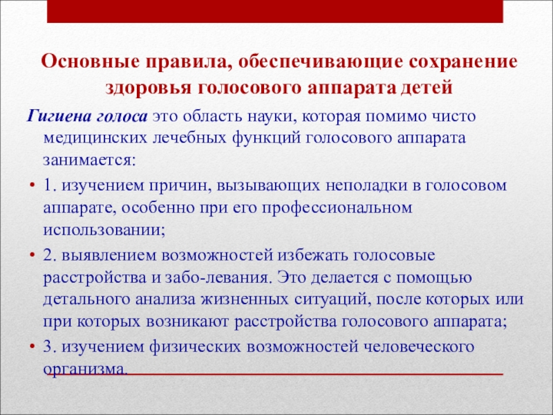 Основные правила, обеспечивающие сохранение здоровья голосового аппарата детейГигиена голоса это область науки, которая помимо чисто медицинских лечебных