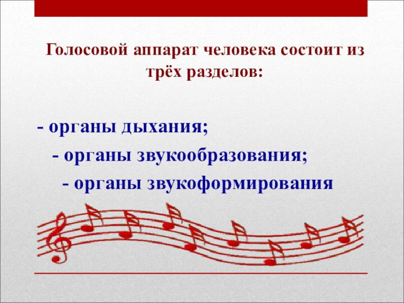 Голосовой аппарат человека состоит из трёх разделов:- органы дыхания;  - органы звукообразования;	 - органы звукоформирования