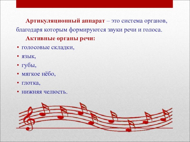 Артикуляционный аппарат – это система органов, благодаря которым формируются звуки речи и голоса.	Активные органы речи:голосовые складки, язык,