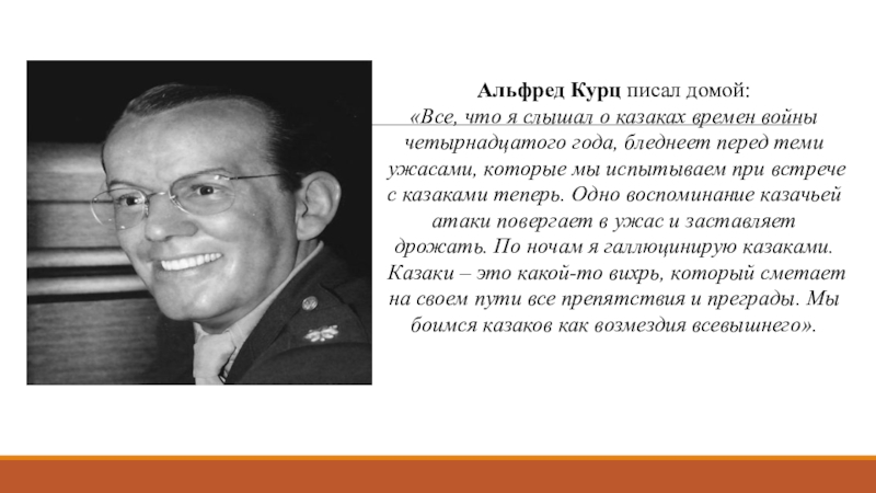 войны четырнадцатого года, бледнеет перед теми ужасами, которые мы испытываем при встрече с казаками теперь. Одно воспоминание казачьей атаки повергает в ужас и заставляет дрожать. По ночам я галлюцинирую казаками. Казаки – это какой-то вихрь, который сметает на своем пути все препятствия и преграды. Мы боимся казаков как возмездия всевышнего».