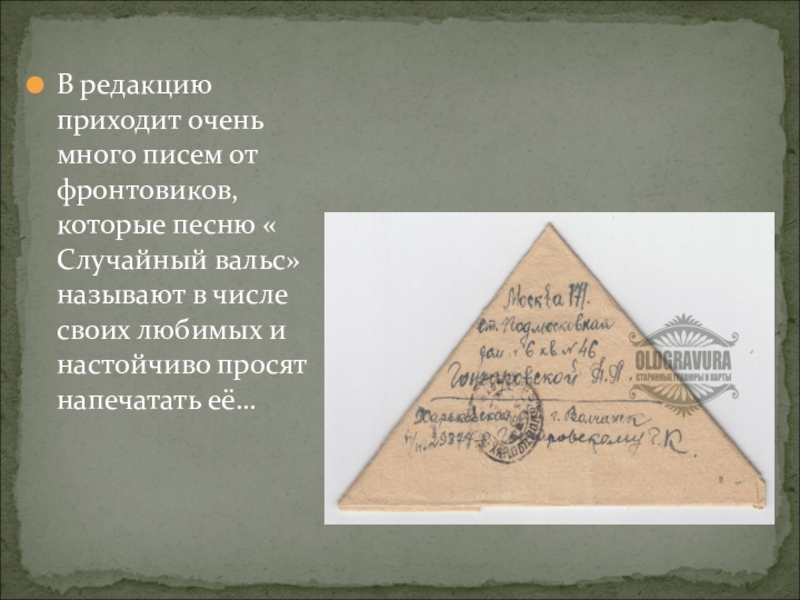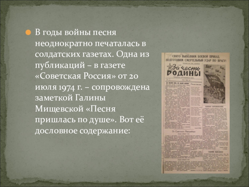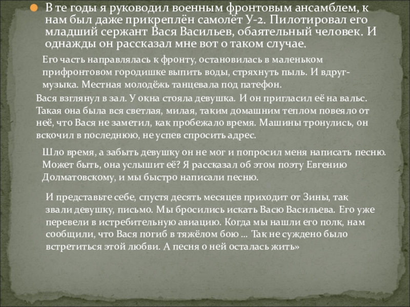 И представьте себе, спустя десять месяцев приходит от Зины, так звали девушку, письмо. Мы бросились искать Васю Васильева. Его уже перевели в истребительную авиацию. Когда мы нашли его полк, нам сообщили, что Вася погиб в тяжёлом бою … Так не суждено было встретиться этой любви. А песня о ней осталась жить»