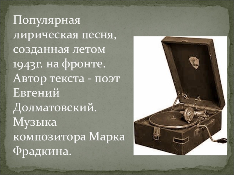 Шло время, а забыть девушку он не мог и попросил меня написать песню. Может быть, она услышит её? Я рассказал об этом поэту Евгению Долматовскому, и мы быстро написали песню.