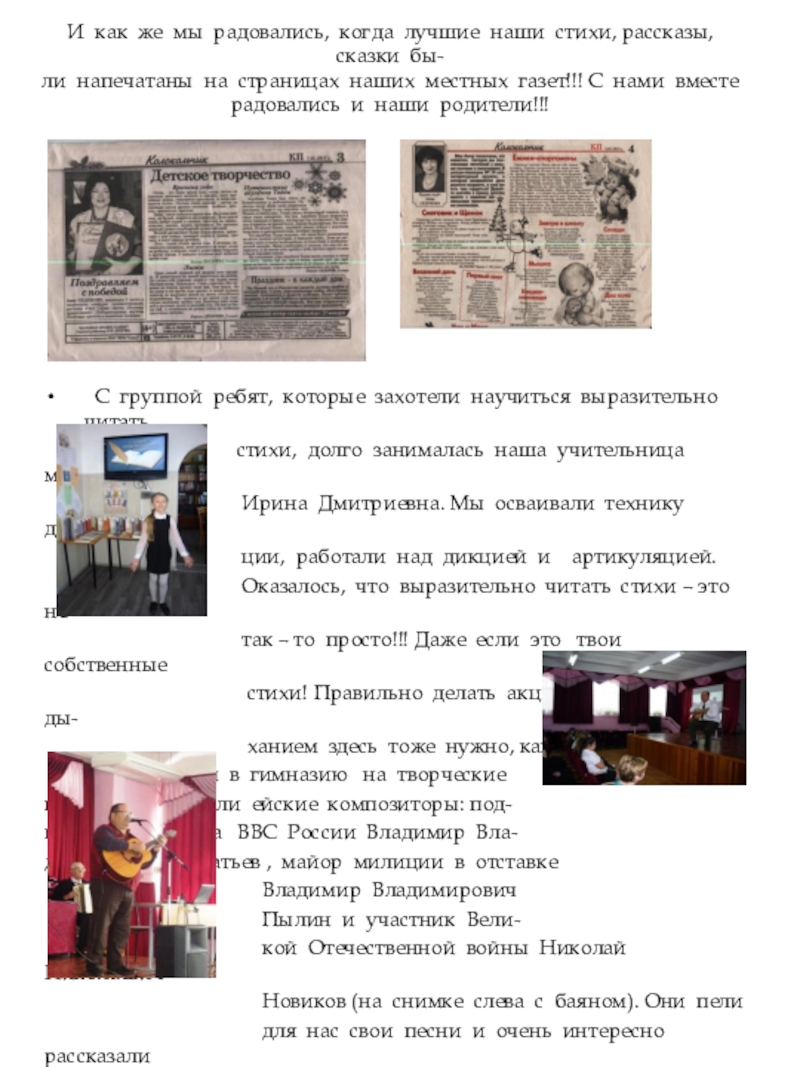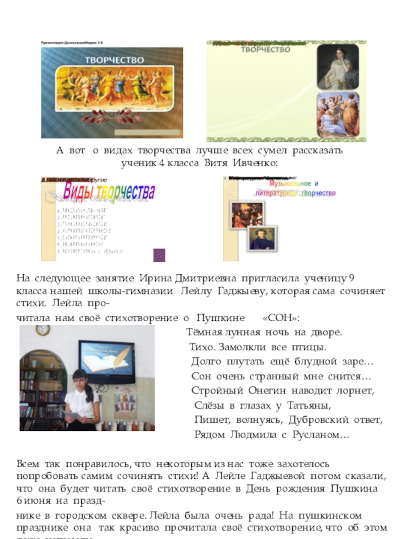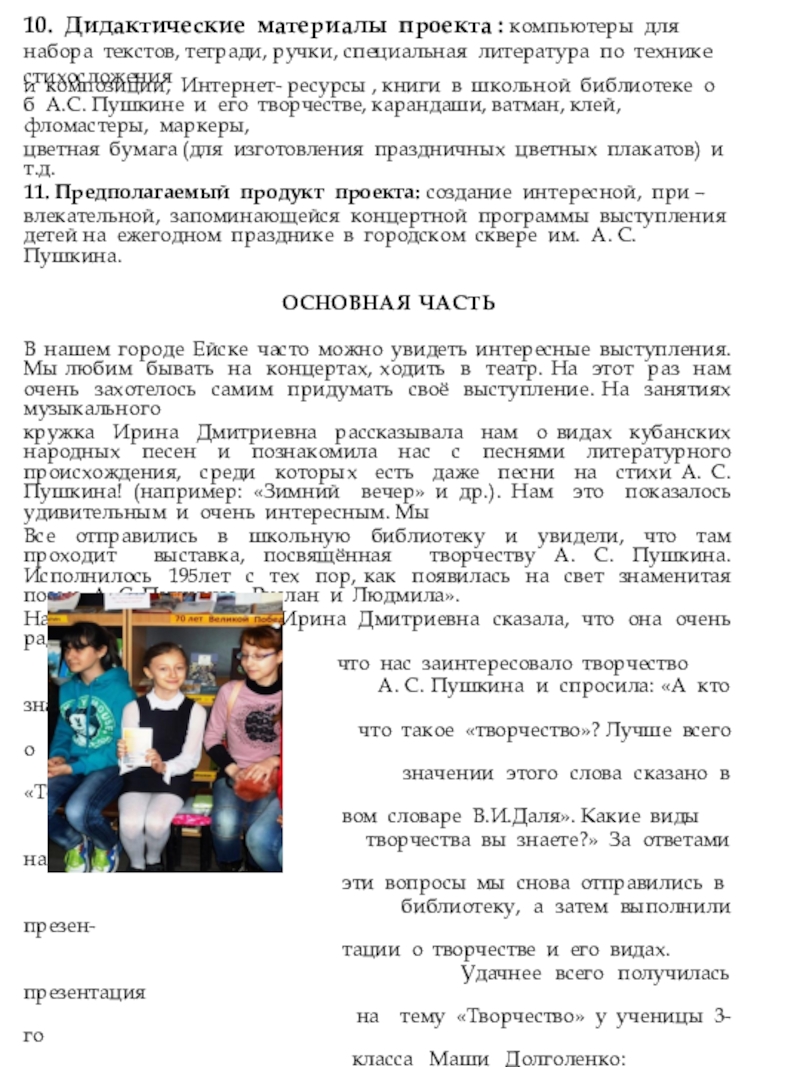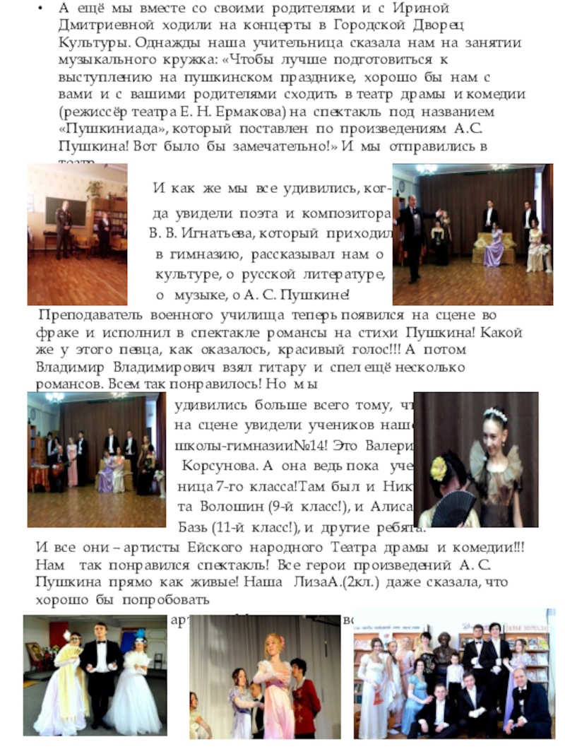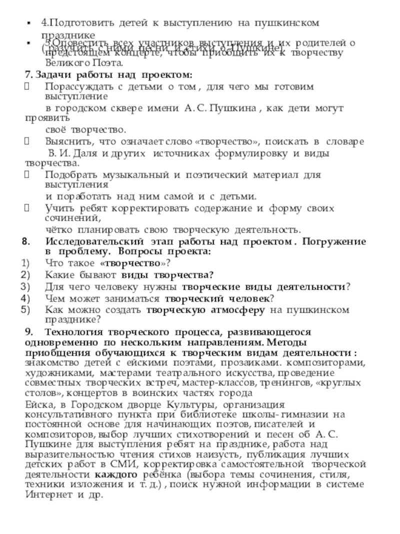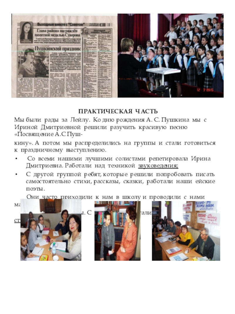 Ейска, в Городском дворце Культуры, организация консультативного пункта при библиотеке школы- гимназии на постоянной основе для начинающих поэтов, писателей и композиторов, выбор лучших стихотворений и песен об А. С. Пушкине для выступления ребят на празднике, работа над выразительностью чтения стихов наизусть, публикация лучших детских работ в СМИ, корректировка самостоятельной творческой деятельности каждого ребёнка (выбора темы сочинения, стиля, техники изложения и т. д.) , поиск нужной информации в системе Интернет и др.