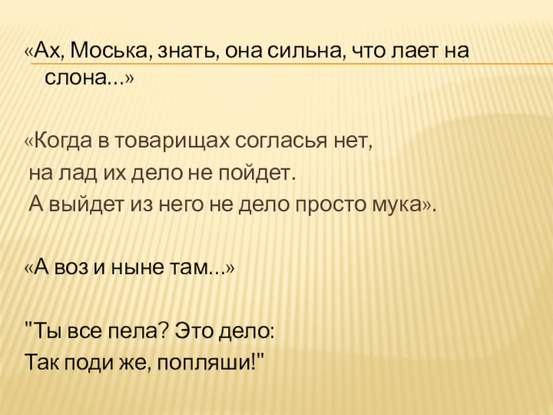 «Ах, Моська, знать, она сильна, что лает на слона…»«Когда в товарищах согласья нет, на лад их дело