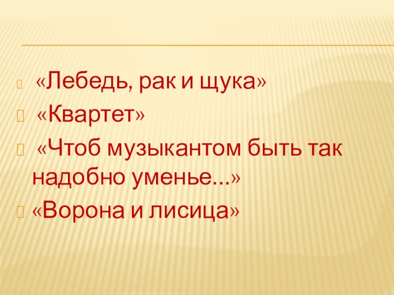 «Лебедь, рак и щука» «Квартет» «Чтоб музыкантом быть так надобно уменье…»«Ворона и лисица»