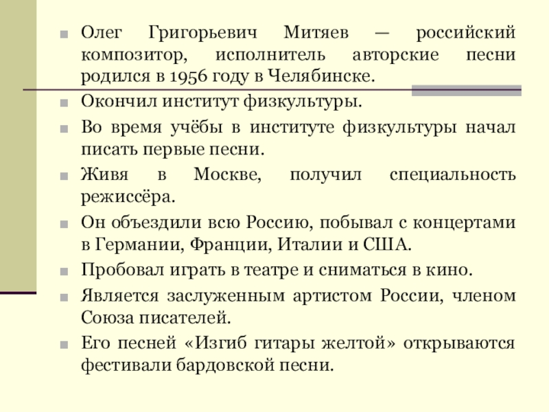Олег Григорьевич Митяев — российский композитор, исполнитель авторские песни родился в 1956 году в Челябинске. Окончил институт