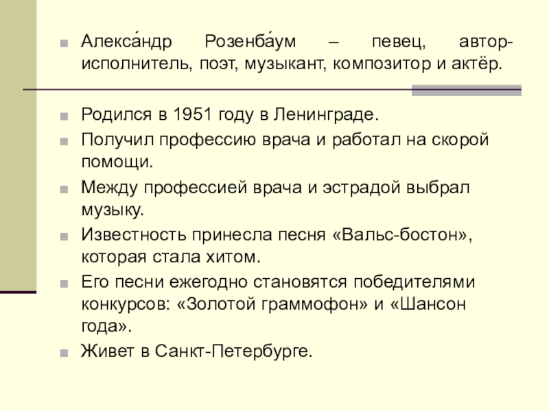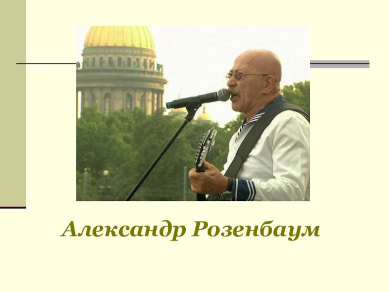 Алекса́ндр Розенба́ум – певец, автор-исполнитель, поэт, музыкант, композитор и актёр.Родился в 1951 году в Ленинграде.Получил профессию врача
