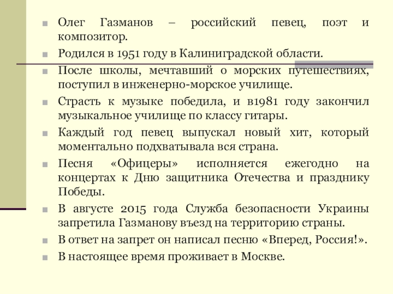 Олег Газманов – российский певец, поэт и композитор.Родился в 1951 году в Калиниградской области.После школы, мечтавший о