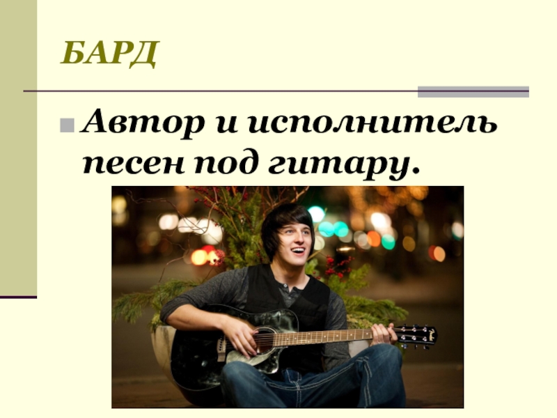 БАРД Автор и исполнитель песен под гитару.