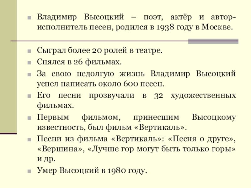 Владимир Высоцкий – поэт, актёр и автор-исполнитель песен, родился в 1938 году в Москве.Сыграл более 20 ролей