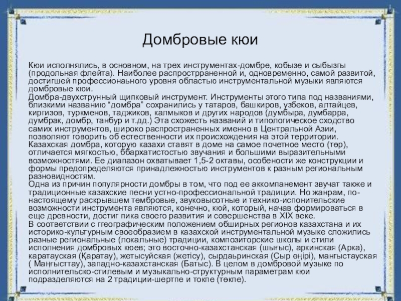 (продольная флейта). Наиболее распрострраненной и, одновременно, самой развитой, достигшей профессионаьного уровня областью инструментальной музыки являются домбровые кюи.