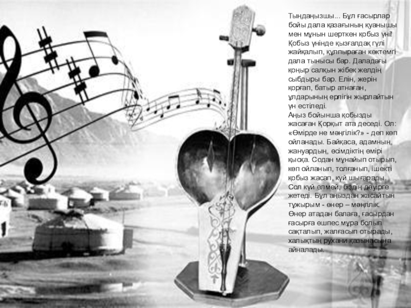 Слайд 10Тыңдаңызшы... Бұл ғасырлар бойы дала қазағының қуанышы мен мұнын шерткен қобыз