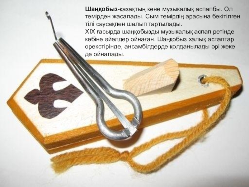 Слайд 20Шаңқобыз-қазақтың көне музыкалық аспапбы. Ол темірден жасалады. Сым темірдің арасына бекітілген