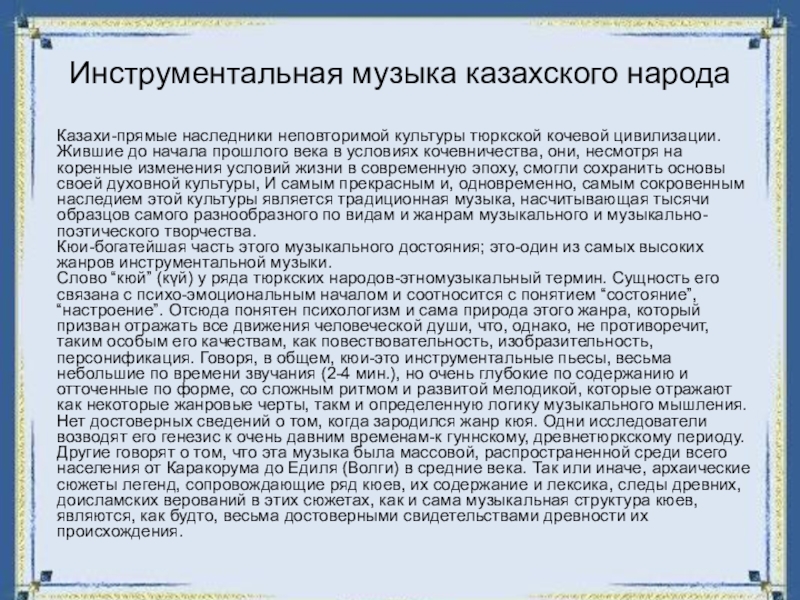 Слово “кюй” (күй) у ряда тюркских народов-этномузыкальный термин. Сущность его связана с психо-эмоциональным началом и соотносится с понятием “состояние”, “настроение”. Отсюда понятен психологизм и сама природа этого жанра, который призван отражать все движения человеческой души, что, однако, не противоречит, таким особым его качествам, как повествовательность, изобразительность, персонификация. Говоря, в общем, кюи-это инструментальные пьесы, весьма небольшие по времени звучания (2-4 мин.), но очень глубокие по содержанию и отточенные по форме, со сложным ритмом и развитой мелодикой, которые отражают как некоторые жанровые черты, такм и определенную логику музыкального мышления.