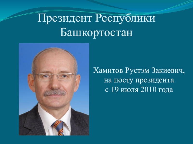 Президент Республики БашкортостанХамитов Рустэм Закиевич, на посту президента с 19 июля 2010 года