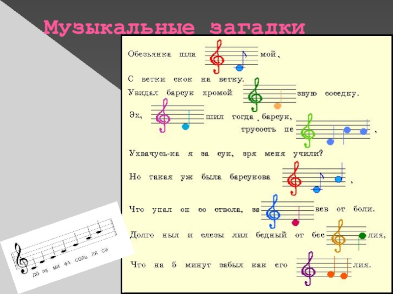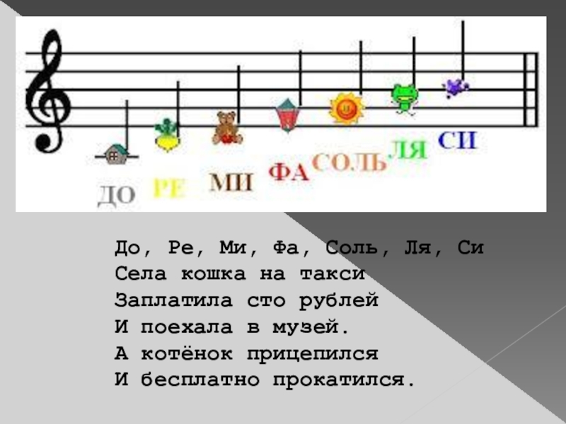До, Ре, Ми, Фа, Соль, Ля, СиСела кошка на таксиЗаплатила сто рублейИ поехала в музей.А котёнок прицепился