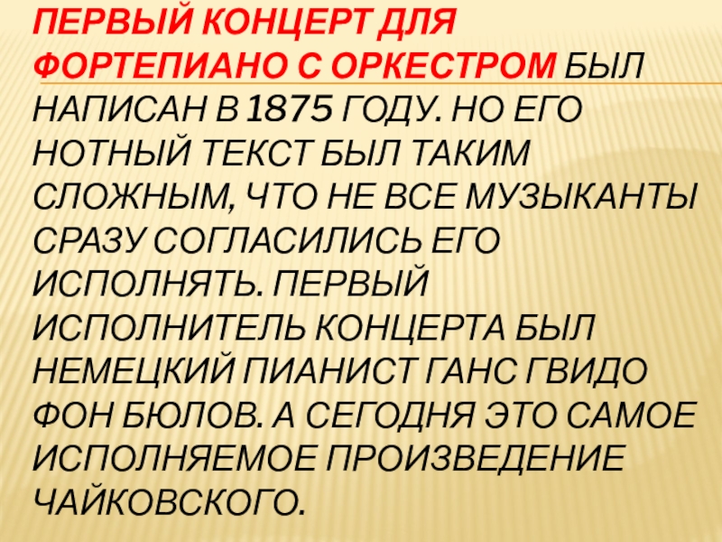 Но его нотный текст был таким сложным, что не все музыканты сразу согласились его исполнять. Первый исполнитель концерта был немецкий пианист Ганс Гвидо фон Бюлов. А сегодня это самое исполняемое произведение Чайковского.