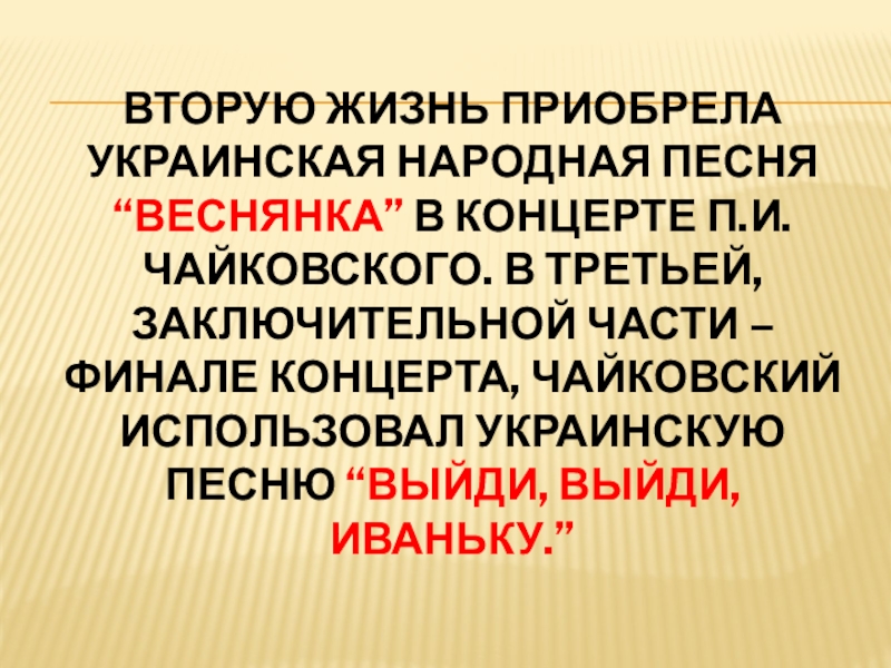 Слайд 8Вторую жизнь приобрела украинская народная песня “Веснянка” в концерте П.И. Чайковского.