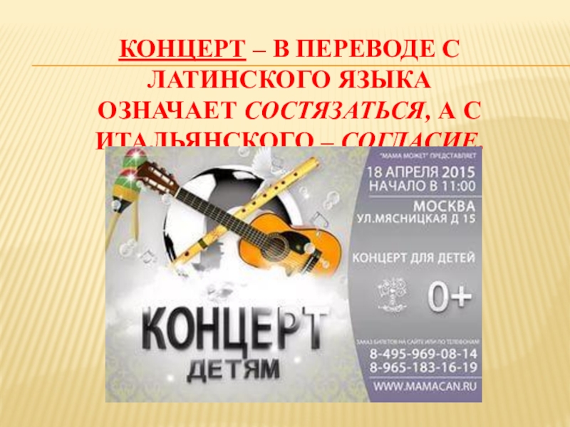 Слайд 2Концерт – в переводе с латинского языка означает состязаться, а с итальянского – согласие.