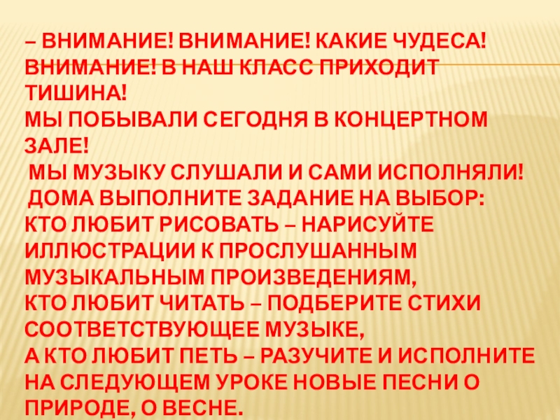 побывали сегодня в концертном зале! Мы музыку слушали и сами исполняли! Дома выполните задание на выбор: кто любит рисовать – нарисуйте иллюстрации к прослушанным музыкальным произведениям, кто любит читать – подберите стихи соответствующее музыке, а кто любит петь – разучите и исполните на следующем уроке новые песни о природе, о весне.