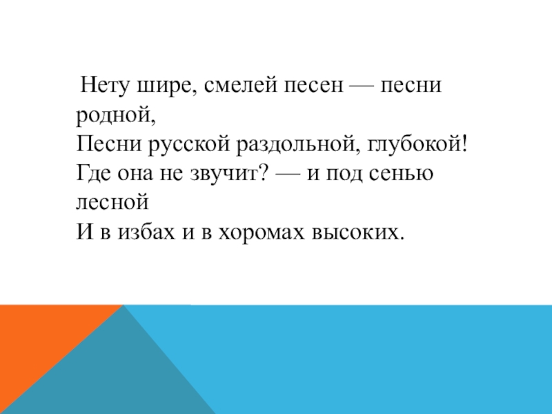 Слайд 11 Нету шире, смелей песен — песни родной,