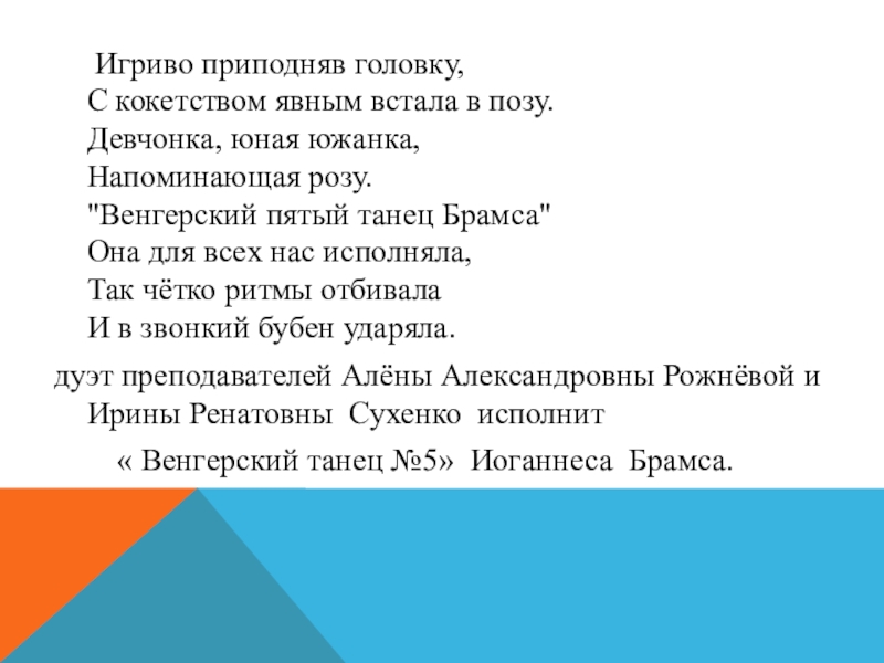 дуэт преподавателей Алёны Александровны Рожнёвой и Ирины Ренатовны Сухенко исполнит