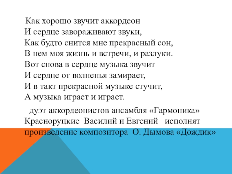 дуэт аккордеонистов ансамбля «Гармоника» Красноруцкие Василий и Евгений исполнят произведение композитора О. Дымова «Дождик»
