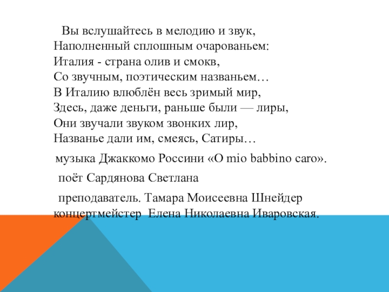 преподаватель. Тамара Моисеевна Шнейдер концертмейстер Елена Николаевна Иваровская.