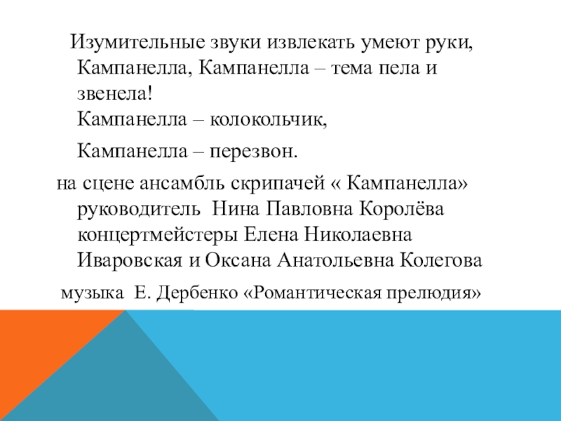 на сцене ансамбль скрипачей « Кампанелла» руководитель Нина Павловна Королёва концертмейстеры Елена Николаевна Иваровская и Оксана Анатольевна Колегова